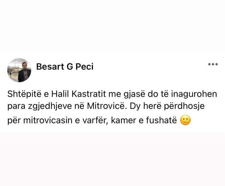 Ndërsa në postimin tjetër, Peci, inaugurimi i shtëpive të ndërtuara nga Halil Kastrati e sheh se do të vije në kohën e fushatës, gjë që e cilëson si fushatë të Agim Bahtirit dhe përdhosje për mitrovicasit e varfër.