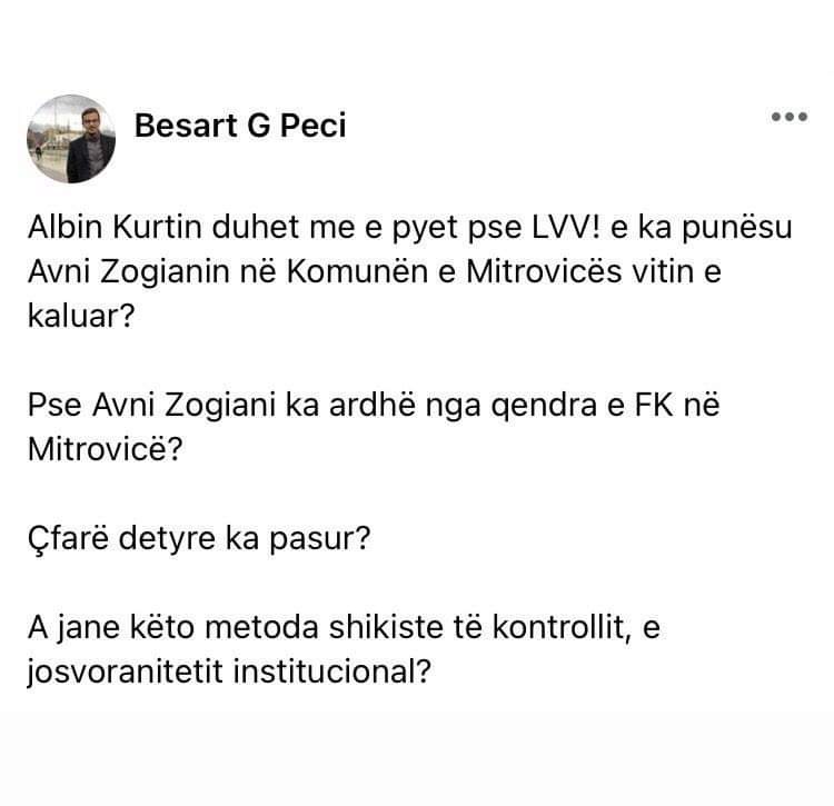 Për një gjë të tillë ka reaguar edhe aktivisti Besart Peci. Përmes dy postimeve në Facebook, Peci ka kërkuar të dijë nga kryeministri Kurti se pse Zogiani është punësuar në Komunën e Mitrovicës.
