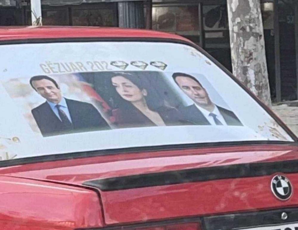 Portretet e Vjosa Osmanit, Albin Kurtit e Glauk Konjufcës, janë vendosur në xhamin e pasëm të një makine të një qytetari, ku sipër fytyrave të tyre është shkruar: Gëzuar 202 dhe në vend të numrit 3, janë paraqitur tre diamantë, që duket se paraqesin liderët e Kosovës./Mitropol/