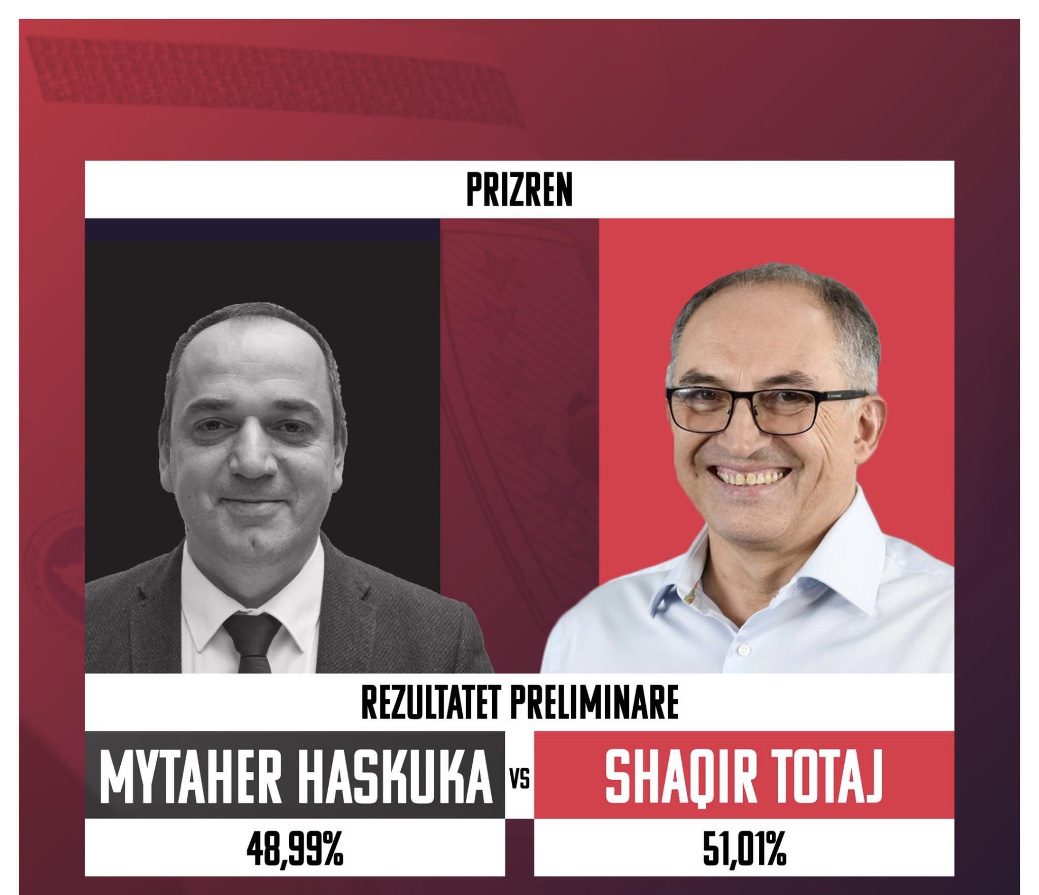 Kujtojmë se në garën e balotazhit për kryetar të komunës së Prizrenit ishin Mytaher Haskuka nga Vetëvendosje dhe Shaqir Totaj nga PDK, ku fitues doli Totaj.
